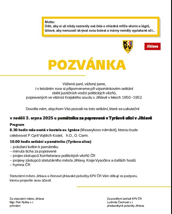 Srdečně zveme na pietní vzpomínkové setkání oběti justičních vražd politických vězňů popravených ve věznici Krajského soudu v Jihlavě v letech 1950-1952. Setkání se uskuteční v neděli 3. srpna 2025. Program začne v 8.30 hodin nedělní mší svatou v kostele sv. Ignáce, kterou bude celebrovat P. Cyril Vojtěch Kodet, Ph.D., O.Carm. a poté v 10.00 hodin proběhne pietní akt u památníku v Tyršově ulici za účasti zástupců města a konfederace politických vězňů.